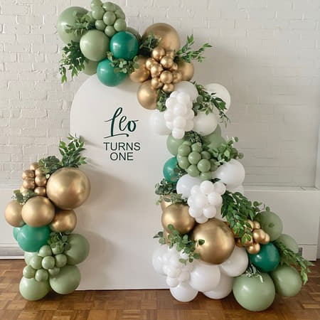 Free standing half arches where no frame is used and the balloons are attached to the wall with command hooks or tied to existing attachment points like nails or curtain rails etc. Organic arches are made from 4 different sized balloons and the overall effect is unstructured and random. These stylish arches are best suited for businesses or homes where there is no problem attaching command hooks to the wall and extra time may be available for set up. Most venues will not allow us to attach to walls so please check with your venue in advance.